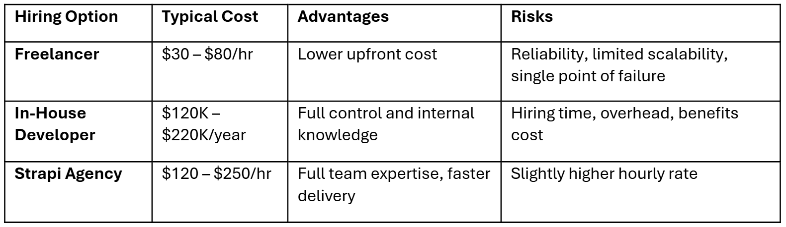 Freelancer vs Strapi Agency vs In-House: Cost and Risk Comparison