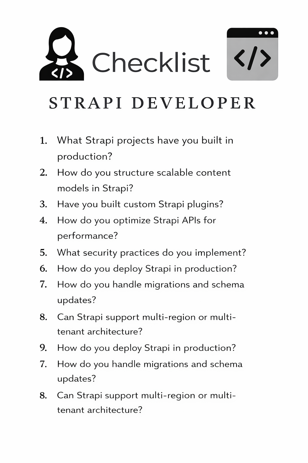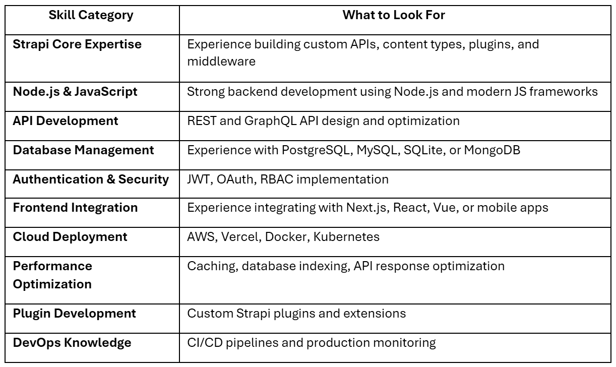 When evaluating candidates or agencies offering Strapi development services, look beyond basic CMS knowledge.