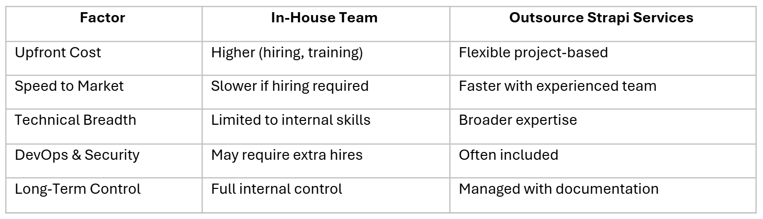 If you already have backend engineers with Strapi experience, in-house can work well.