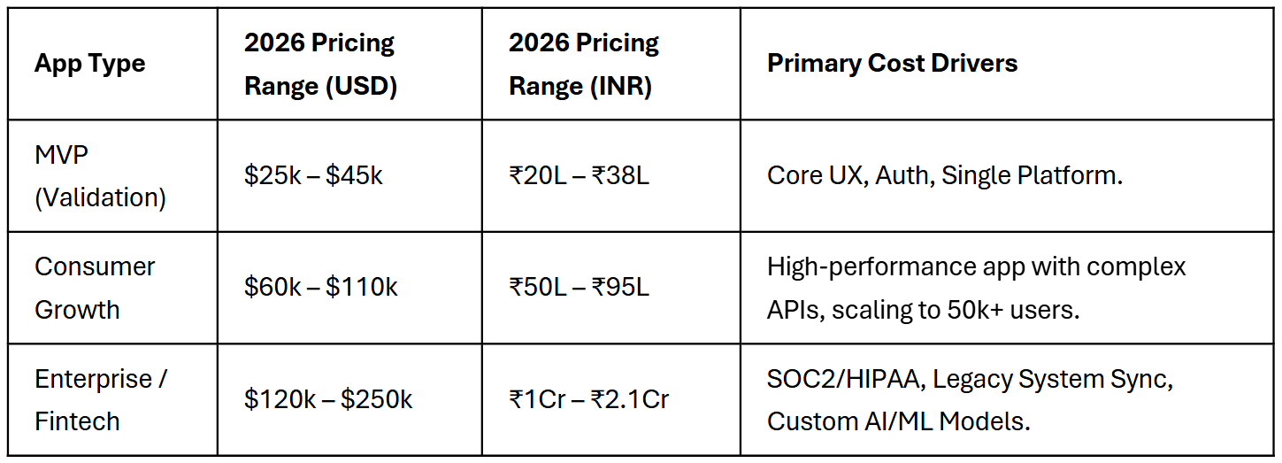 In 2026, the cost of building a production-grade mobile app typically ranges from $25,000 to $150,000 (approx. ₹20L to ₹1.2Cr). While low-code tools are great for quick prototypes, professional app pricing is driven by modern essentials: seamless AI integration, SOC2/HIPAA security compliance, and a scalable cross-platform architecture that doesn't break when you hit your first 1,000 users.