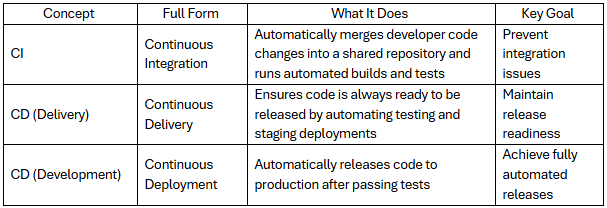 CI/CD stands for Continuous Integration and Continuous Delivery (or Continuous Deployment).