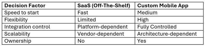 - Hybrid build: A custom mobile layer that integrates with existing systems using APIs